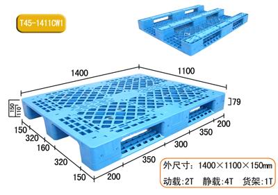 產(chǎn)品型號: HD-1411cw1 產(chǎn)品貨號: T45川字型塑料托盤 產(chǎn)品外尺寸: 1400×1100×150mm 產(chǎn)品內(nèi)尺寸: 產(chǎn)品結(jié)構(gòu): 單面網(wǎng)格川字底型 產(chǎn)品內(nèi)容量(L): 承重量(T): 動(dòng)載2T,靜載4T,貨架載1T 產(chǎn)品認(rèn)可標(biāo)準(zhǔn): ISO9001:2000質(zhì)量體系認(rèn)證