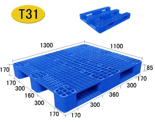 產(chǎn)品型號: HD-1311CW1 產(chǎn)品貨號: T31 產(chǎn)品外尺寸: 1300×1100×170mm 產(chǎn)品內尺寸: 產(chǎn)品結構: 單面網(wǎng)格川字底型 產(chǎn)品內容量(L): 承重量(T): 動載1.5T,靜載6T,貨架載0.6T 產(chǎn)品認可標準: ISO9001:2000質量體系認證 該塑料托盤適合平地墊倉、碼垛和上貨架使用;