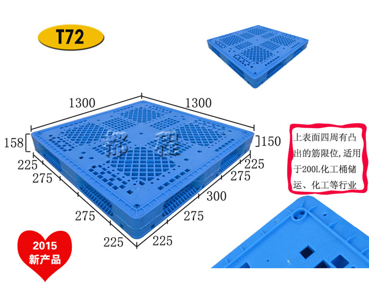 編號(hào) T72 外尺寸(mm) 1300*1300*158 動(dòng)載(t) 1.5 靜載(t) 6 貨架(t) 1 可內(nèi)置鋼管,適用于200L化工桶儲(chǔ)運(yùn)、化工等行業(yè)。